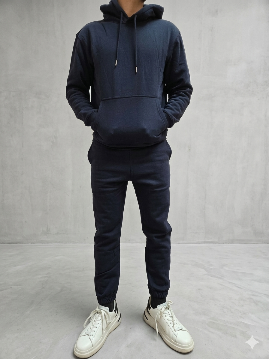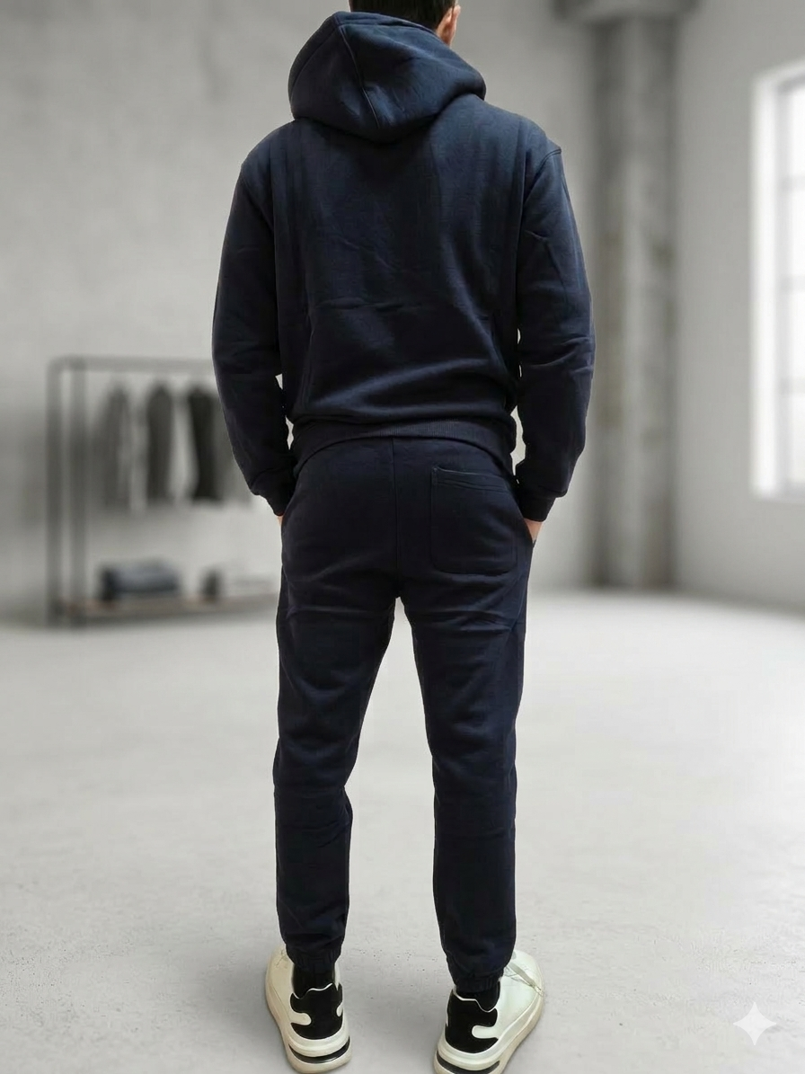 Tuta sportiva con pantalone e felpa con cappuccio di color blu scuro.